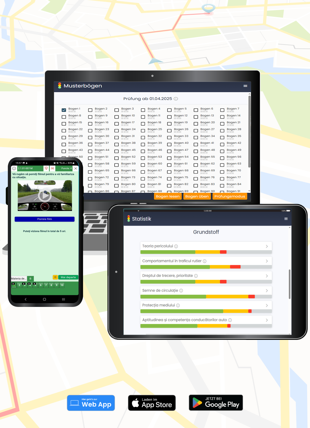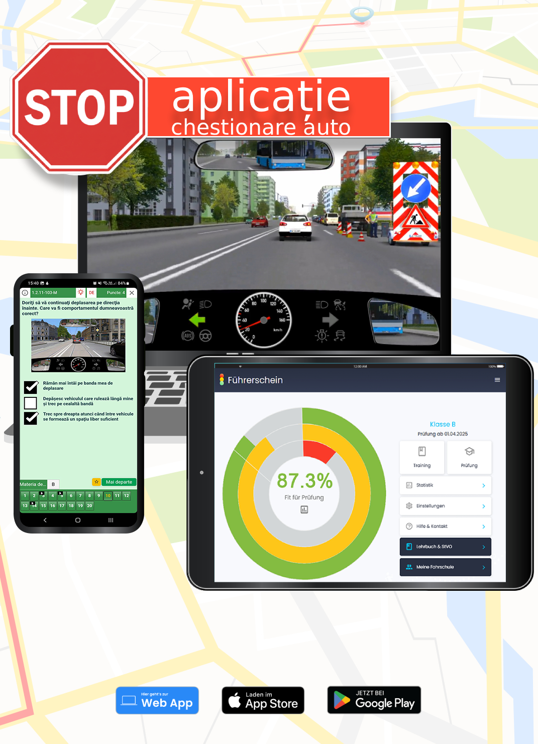 Aplicație cu 99 de chestionare auto – accesibilă oriunde. Aplicația pentru categoria B este disponibilă pe toate dispozitivele: telefon sau tabletă iOS și Android, dar poate fi folosită și direct pe laptop prin Web-App. Progresul tău se sincronizează automat între dispozitive, astfel încât să poți învăța oriunde și oricând.