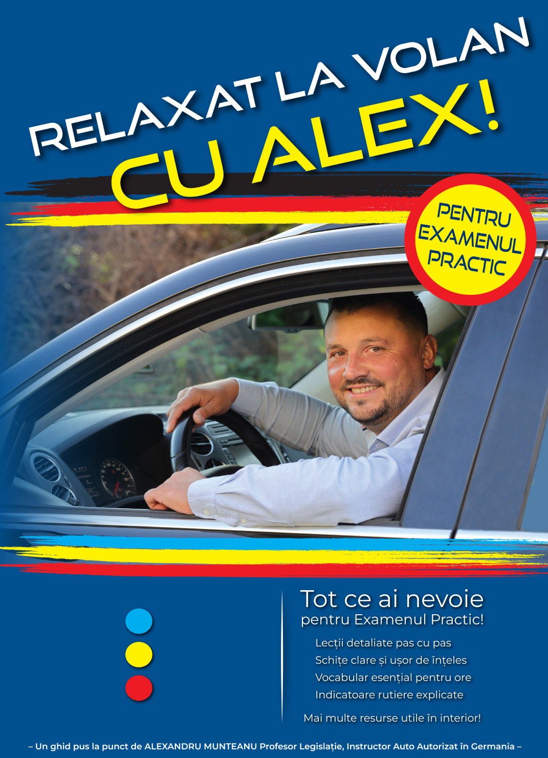 Conținut: Aplicație chestionare auto + Manual examen practic „Relaxat la volan cu Alex!”