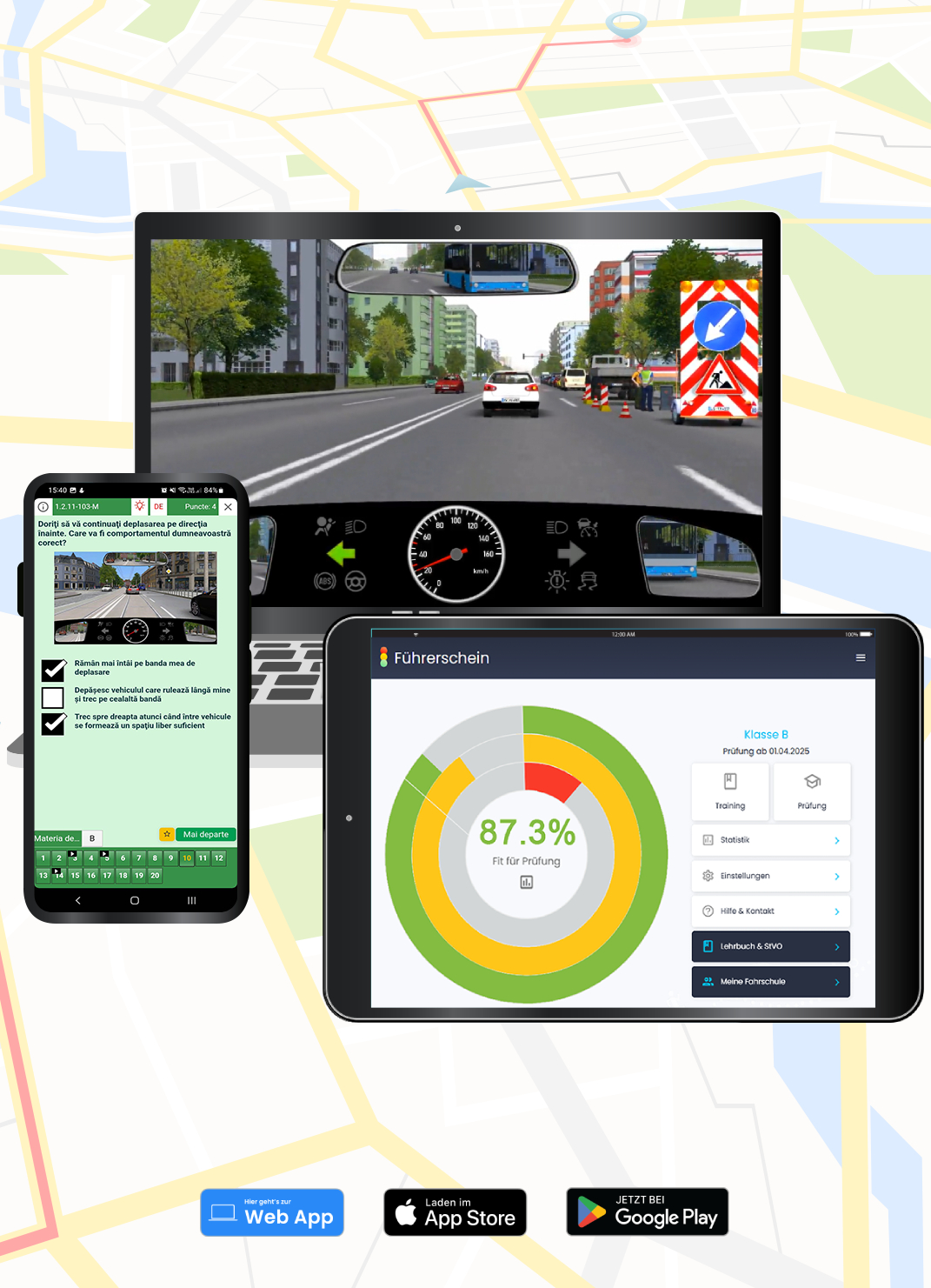 Tot conținutul, de la manual la întrebările din aplicație, este în limba română și respectă legislația actualizată 2025 – 2026, ca să te pregătești fără stres pentru permisul de conducere în Germania.